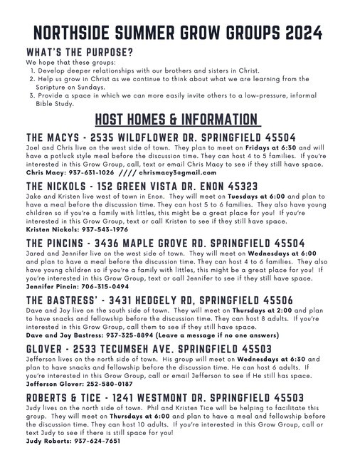 You should definitely get plugged in for 8 weeks out of this summer for one of our in-home Grow Groups! We have different options throughout the area and different days and times to align with your schedule. If you and your family would like to join with others for a fun weekly discussion and time of fellowship, please contact a host below to see if they still have space.